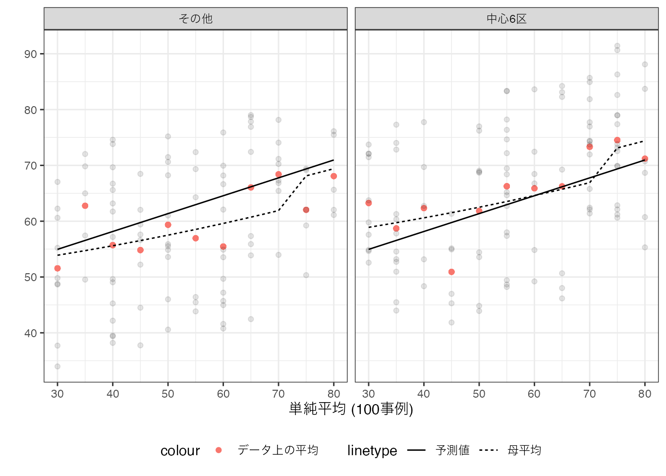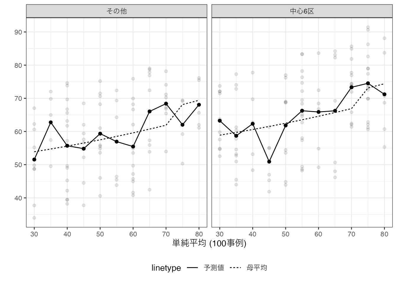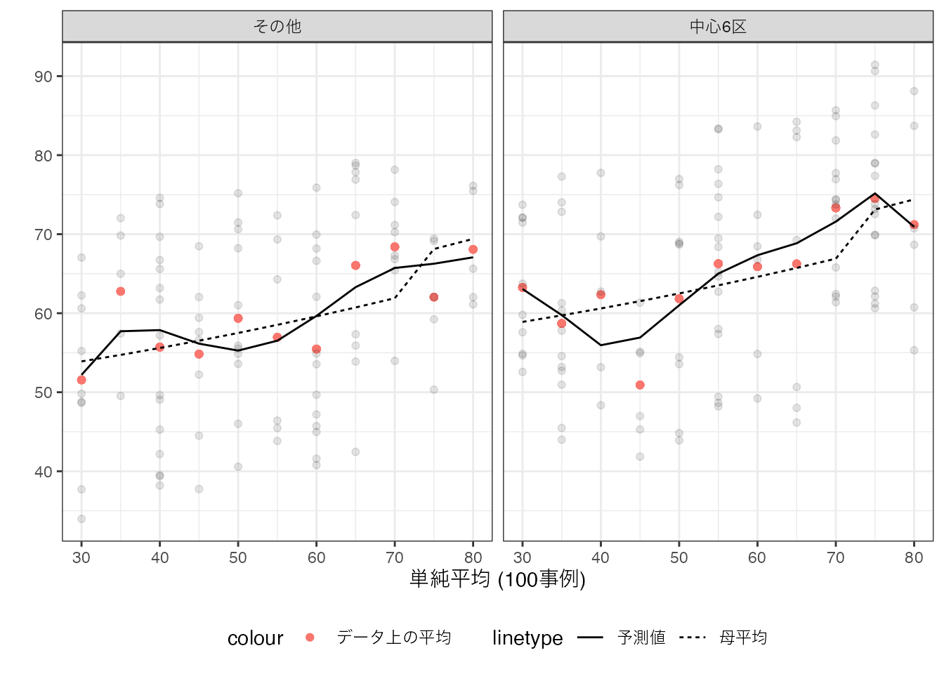 点線が母平均、実線が丸暗記法が生み出した予測値となります。 母平均と予測値が、大きく乖離するグループが散見されます。 このような乖離は、データが母平均よりも上振れ/下振れしたケースにおいて、見られることも確認できます。