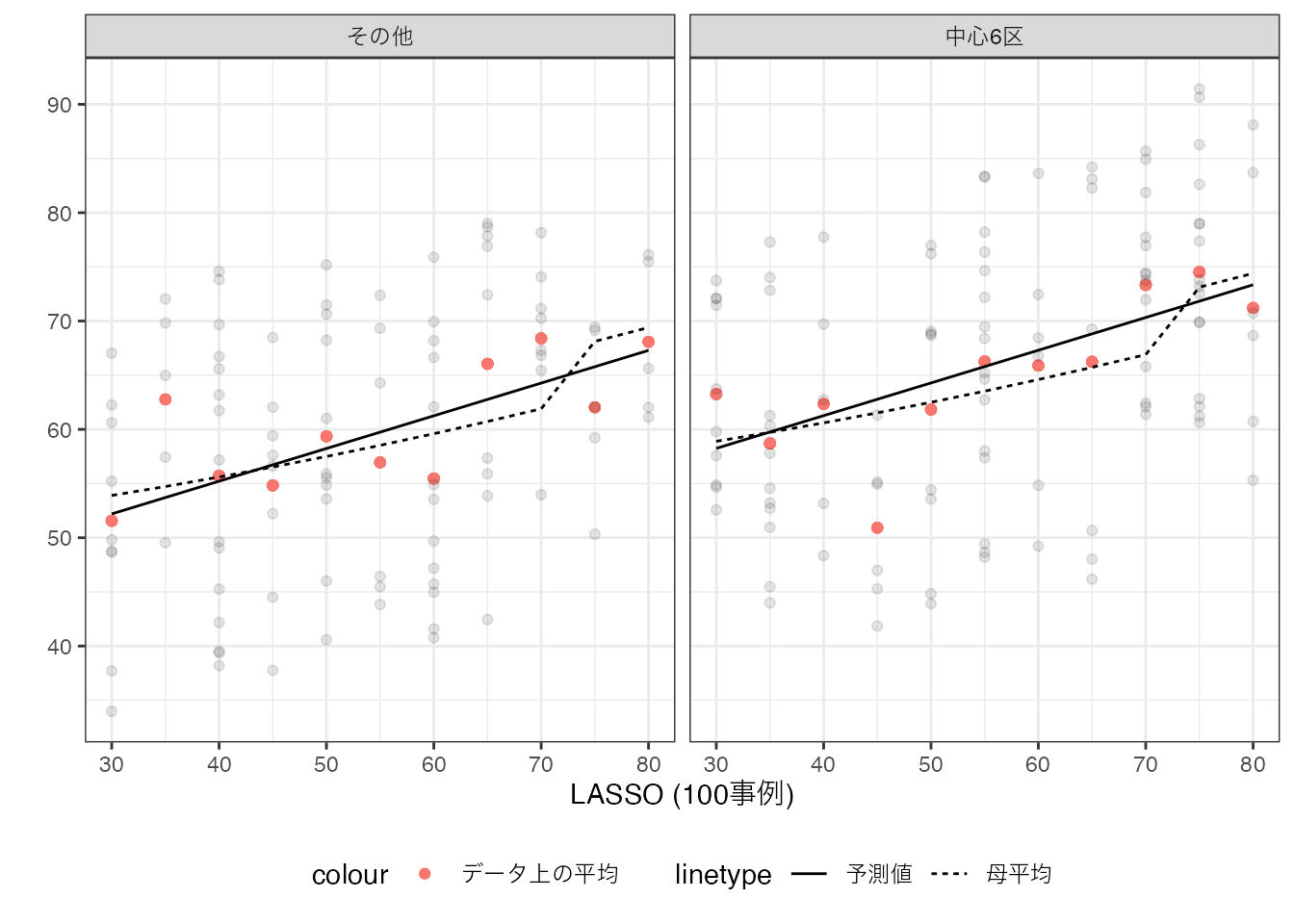単純平均とは異なり、広い物件は取引価格が高くなる傾向を捉えることができています。 さらに丸暗記法ほど、母平均から大きく乖離した予測も見られません。 これは丸暗記法と比べて、事例の要約が機能していることを表しています。