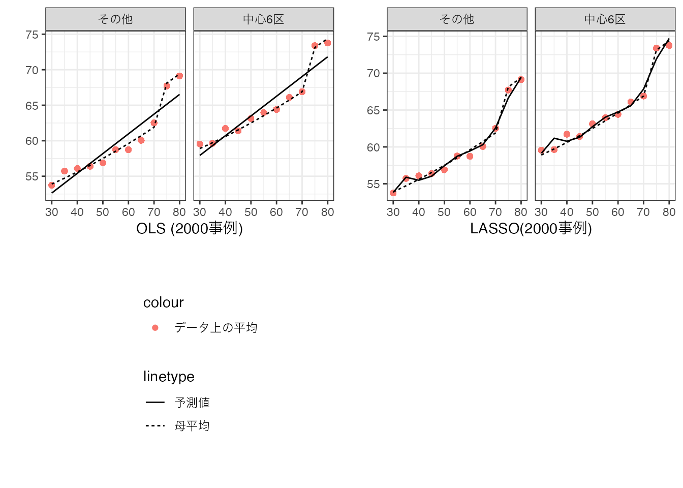 母平均が持つ複雑な性質を捉えるために、交差効果と高次項を導入し、さらに複雑なモデルを推定してみます。 \[予測値 = \beta_0 + \beta_1 Size+\beta_7District + \underbrace{\beta_2Size^2 +..+\beta_6Size^6}_{高次項}\] \[+\underbrace{\beta_8 Size\times District +..+\beta_{14}Size^6\times District}_{交差効果}\] このような複雑なモデルであったとしても、データへの適合度を最大化するように推定できます。 ただし、複雑すぎると母平均から乖離してしまいます。